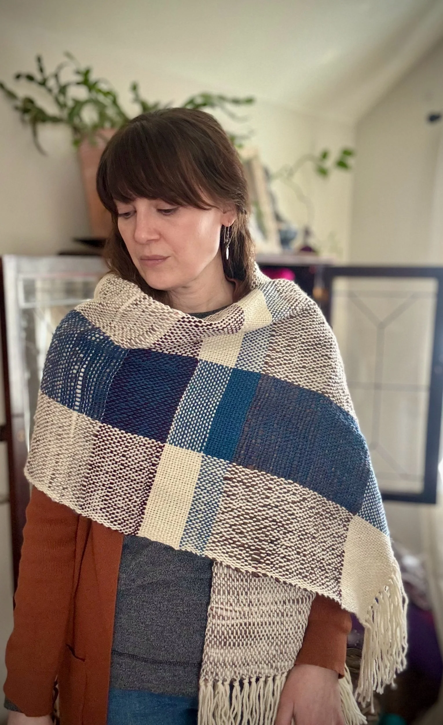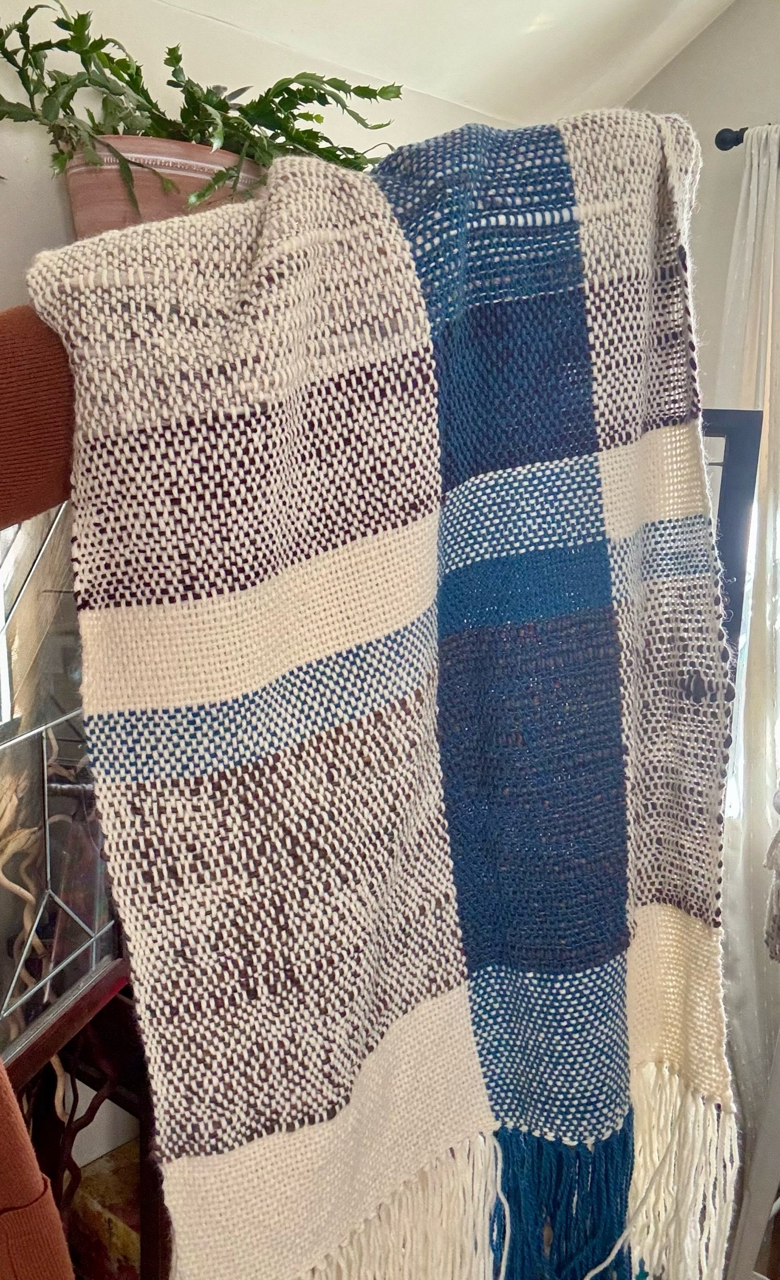"Margot" is woven using handspun merino wool and wool blend yarn, was created to be worn as a shawl or blanket scarf; however, could be used as a table runner, a multi-purpose piece.